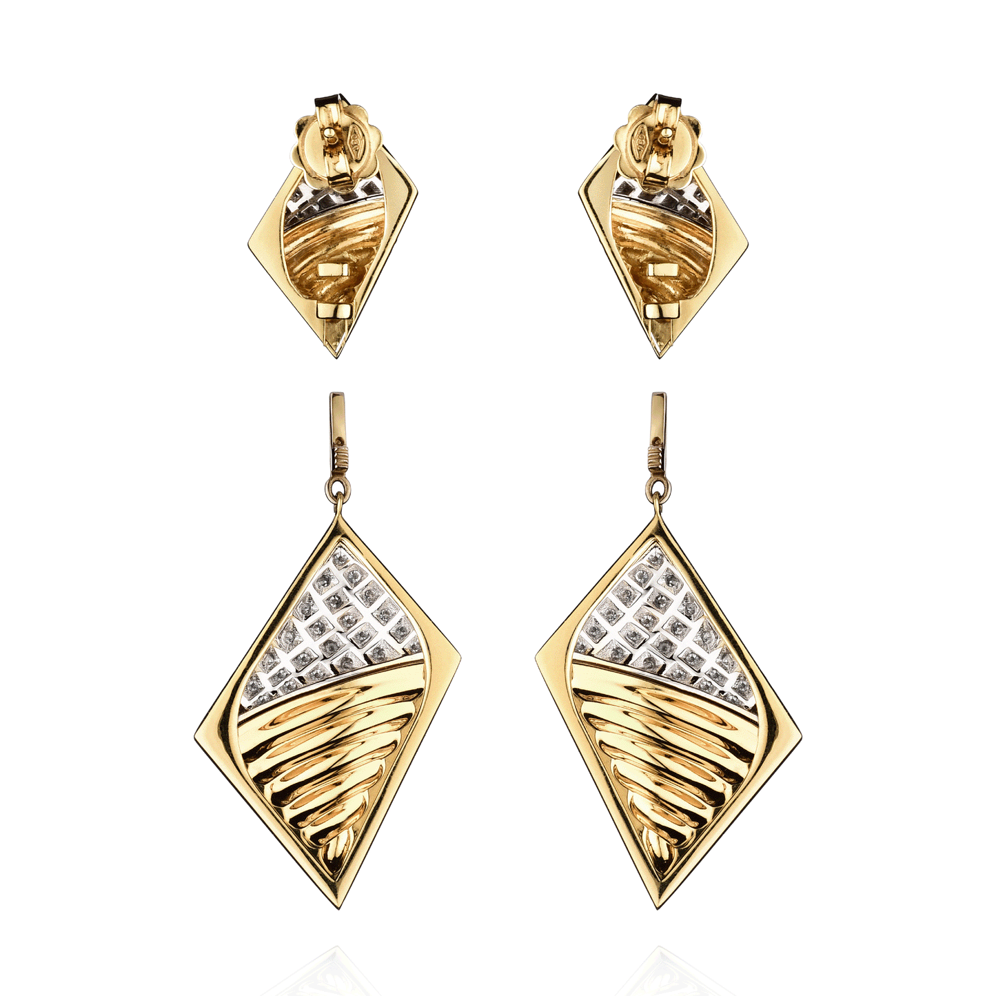 Designed with a discreet rear mechanism, the detachable pendant element allows the earrings to be worn with or without the lower section, offering versatility in styling. The pendant can also be interchanged with the full-diamond version available on our website, enabling a personalized interpretation of the design.