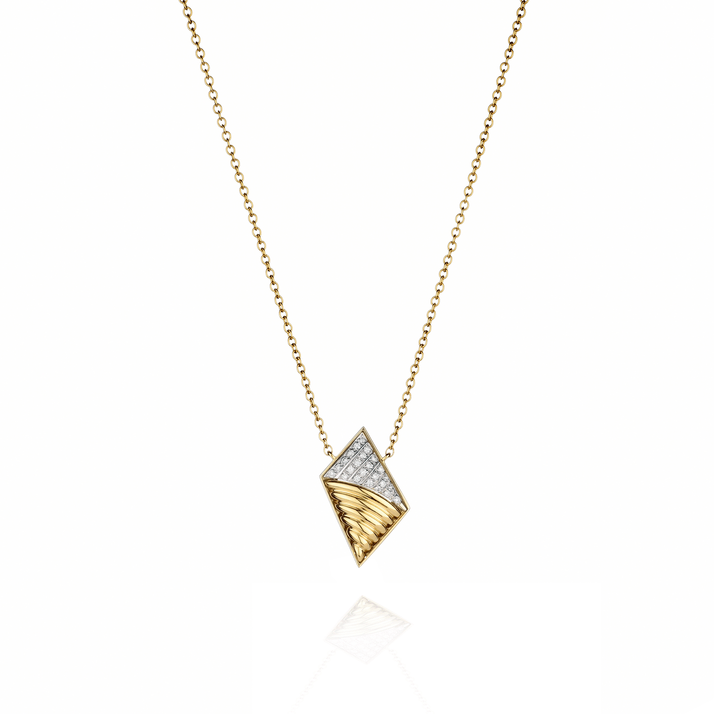 A refined sculptural pendant crafted in 18 kt yellow and white gold, adorned with natural white diamonds. A delicate sequence of luminous waves inspired by the primordial architecture of pyramids and their symbolic connection to the Orion constellation. Through a subtle interplay of solid and void, light and matter, the jewel evokes a bridge between earth and sky, strength and infinity.